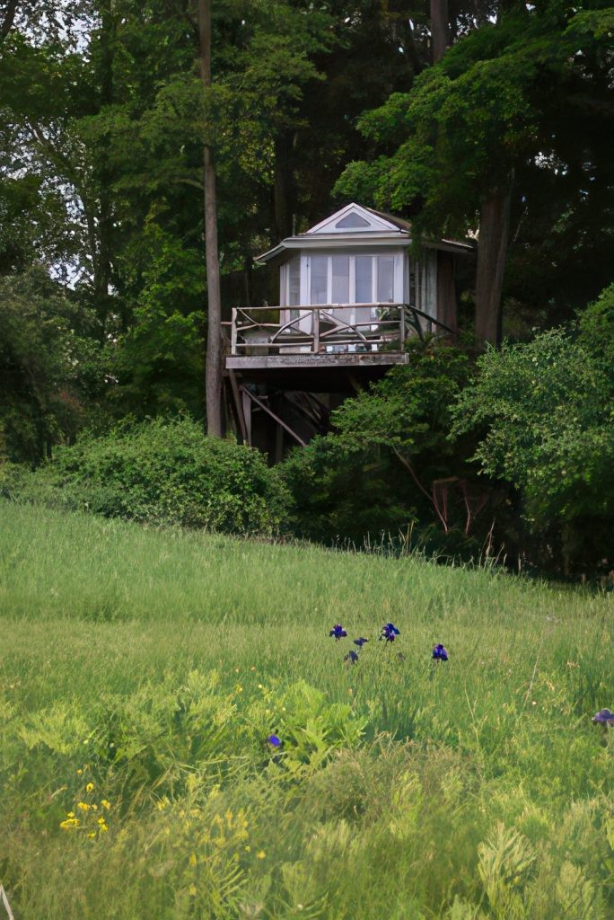 “My tree house refreshes my eyes and my spirit,” says writer Maxine Paetro of the five-sided structure perched in the trees at the edge of her upstate New York garden. “The Tree House of the August Moon is a peach-stucco folly with lots of windows and doors and built-in seating that looks out over distant hills,” she notes.